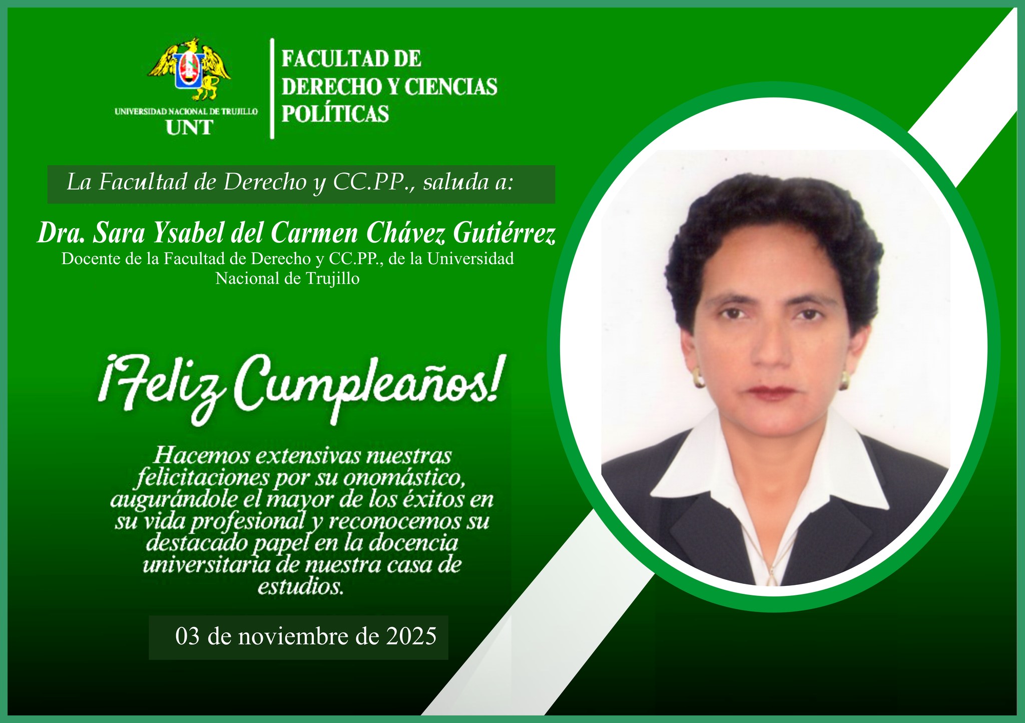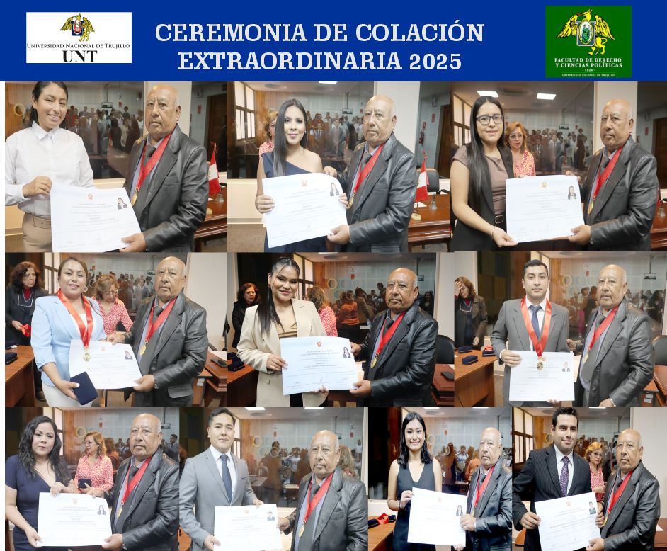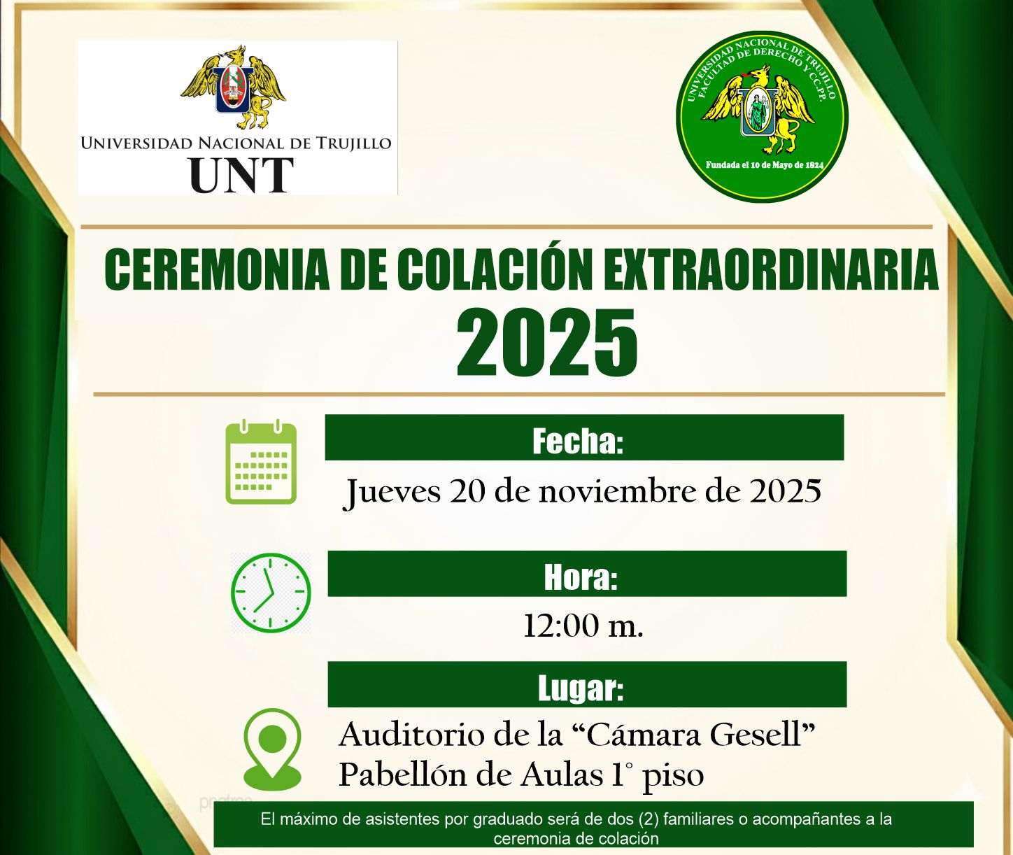 Con éxito se desarrolló la Ceremonia de Colación Extraordinaria de los egresados de Derecho y Ciencia Política y Gobernabilidad en la Facultad de Derecho y Ciencias Políticas de la Universidad Nacional de Trujillo, dicho evento se realizó en el auditorio de la "Cámara Gesell" de esta Facultad. El evento reunió a nuestros flamantes profesionales, quienes recibieron el reconocimiento académico correspondiente, acompañados de sus familias, autoridades universitarias y comunidad académica. Felicitamos a cada uno de los egresados por este importante logro y les deseamos los mayores éxitos en su trayectoria profesional. Dr. Teódulo Jenaro Santos Cruz Decano