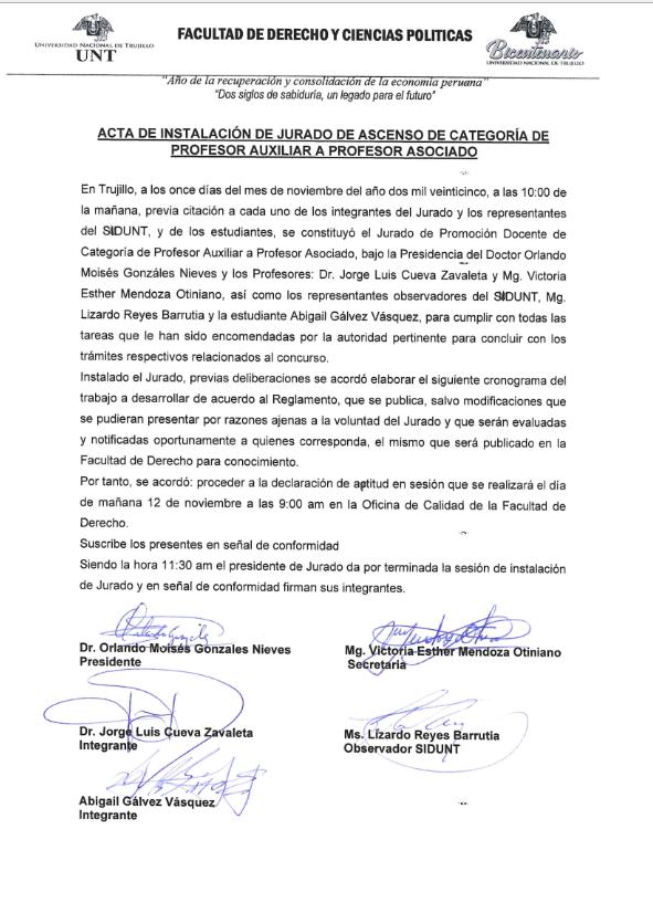 Mediante Acuerdo de Consejo de Facultad, se reconoció al equipo integrado por los estudiantes 𝗠𝗮𝗿𝗶𝗻𝗮 𝗟𝗶𝘇𝗲𝘁𝗵 𝗚𝗼𝗻𝘇𝗮𝗹𝗲𝘀 𝗧𝗼𝗿𝗿𝗲𝘀, 𝗣𝗲𝗿𝗰𝘆 𝗥𝗶𝗰𝗵𝗮𝗿𝗱 𝗩𝗶𝗹𝗹𝗮𝗻𝘂𝗲𝘃𝗮 𝗚𝗼𝗻𝘇𝗮́𝗹𝗲𝘇, 𝗝𝗲𝘀𝘂́𝘀 𝗱𝗲𝗹 𝗥𝗼𝗰𝗶́𝗼 𝗣𝗲𝗿𝗲𝗱𝗮 𝗭𝗲𝗹𝗮𝗱𝗮 y 𝗥𝗼𝘀𝘀𝗺𝗲𝗿𝘆 𝗔𝗻𝗴𝗲́𝗹𝗶𝗰𝗮 𝗧𝗼𝗿𝗿𝗲𝘀 𝗕𝗿𝗶𝗰𝗲𝗻̃𝗼, quienes representaron a la Facultad de Derecho y Ciencia Política de la Universidad Nacional de Trujillo en el 𝗠𝗼𝗼𝘁 𝗖𝗼𝘂𝗿𝘁 𝗔𝗬𝗡𝗜 𝟮𝟬𝟮𝟱, obteniendo el Primer Puesto a nivel general